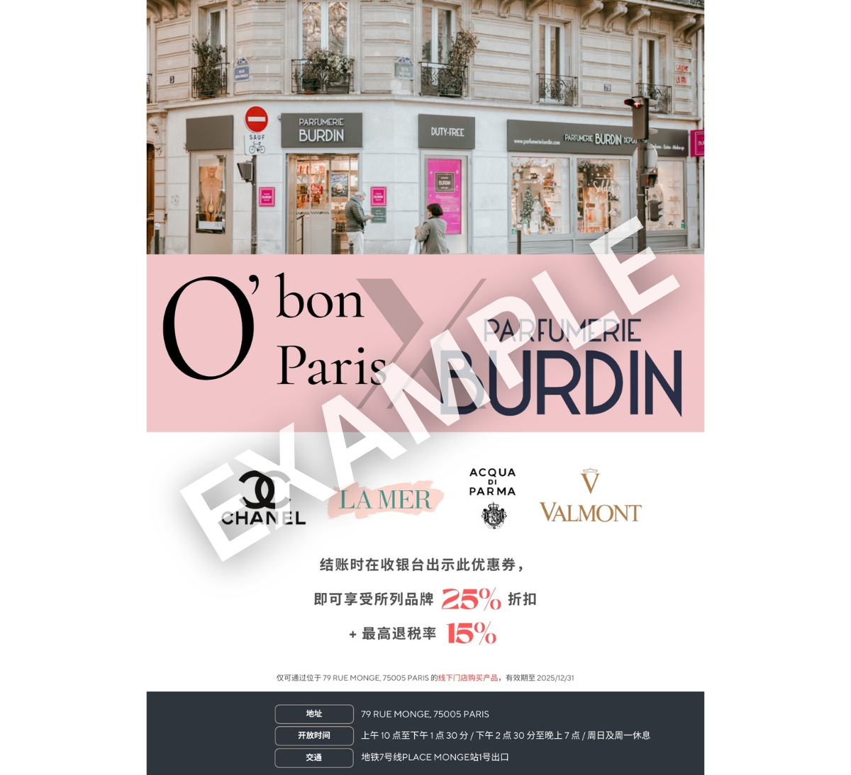 - 您可以同时享受欧棒巴黎的专属优惠 + 15%的退税服务(需至少消费100欧元)。如需退税,还请务必携带您的护照原件(不接受复印件)。