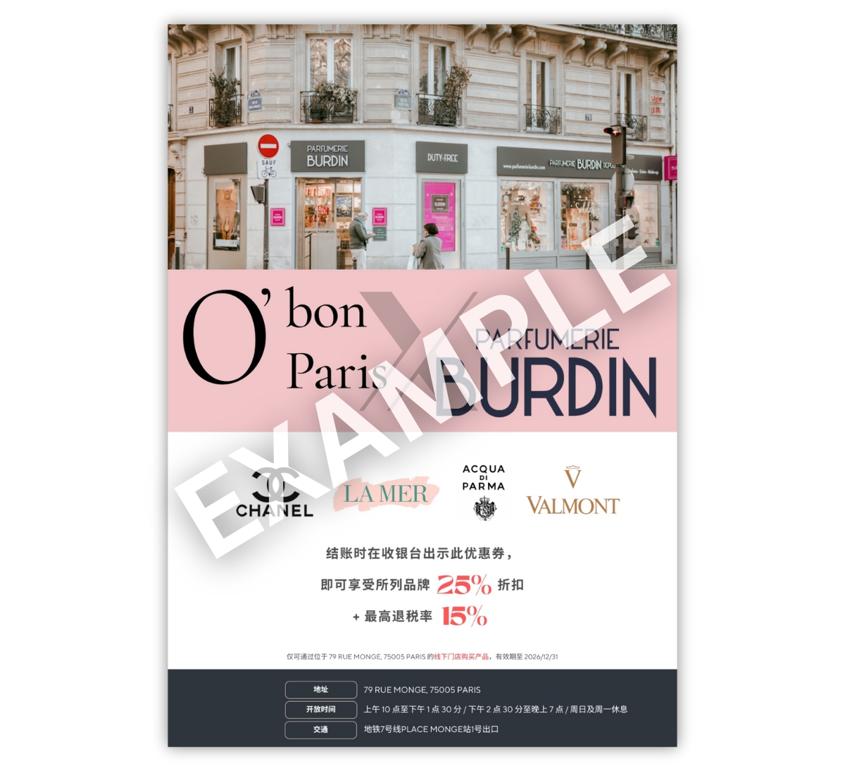 Burdin是一家由家族经营的法国香水店,创建于1937年。您可以在这里找到最知名品牌(香奈儿、迪奥、娇兰、倩碧、YSL、兰蔻、雅诗兰黛、资生堂……)的香水、化妆品和护肤品。店内人员会根据您的个人要求帮您挑选最适合您的产品。下载您的O'Bon Paris优惠券,以享受香奈儿,海蓝之谜,帕尔马水和Valmont产品的25%折扣。不适用于已经打折的项目。您还可以通过任何购买获得免费样品或小礼物。