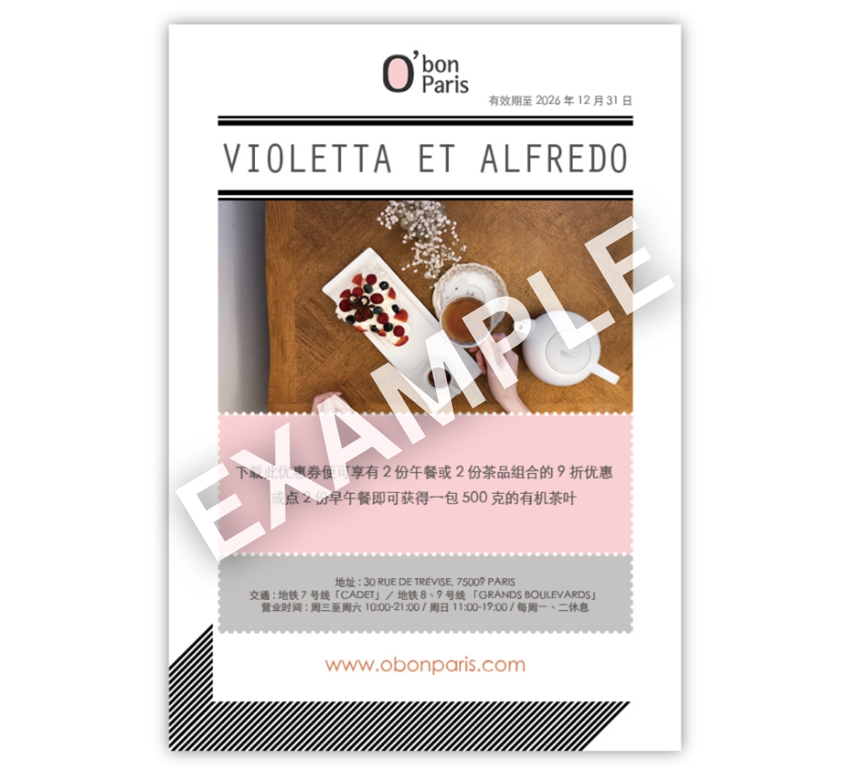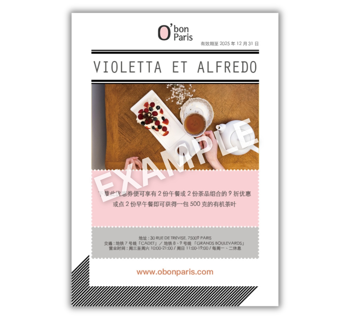 下载O’bon Paris的优惠券便可享有2份午餐或2份茶点组合的9折优惠。或点2份早午餐,即可获得一包500公克的有机茶叶。