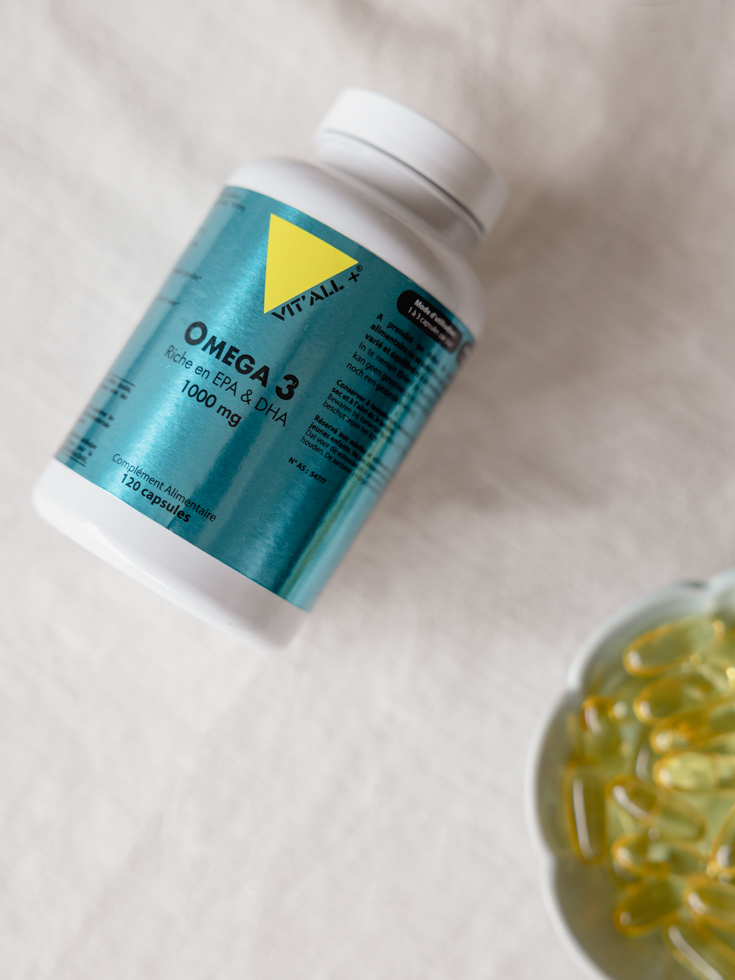 Omega-3 脂肪酸是一种对健康各个方面(眼睛、心脏和神经系统)都有积极作用的脂肪,有助于降低血液中的甘油三酯和胆固醇水平。人体无法自然产生 Omega-3 脂肪酸,因此我们必须通过饮食摄取,也可以通过膳食补充剂补充:Vit'All+ 补充剂含有两种最佳的 Omega-3 脂肪酸:EPA 和 DHA。