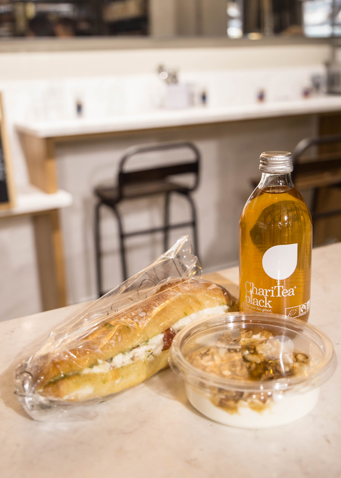 三明治(山羊干酪、干火腿、胡椒)和新鲜优格配坚果和蜂蜜,饮料需另外点。
