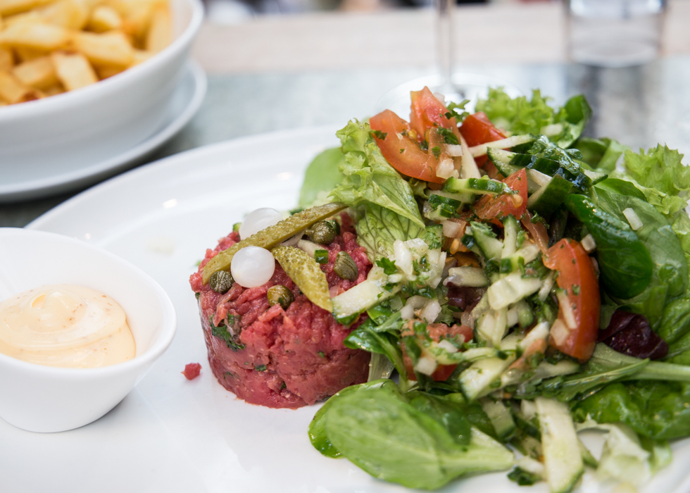 我们点了鞑靼牛肉、有机沙拉和比利时薯条。 'Smakelijk'! (请享用!)