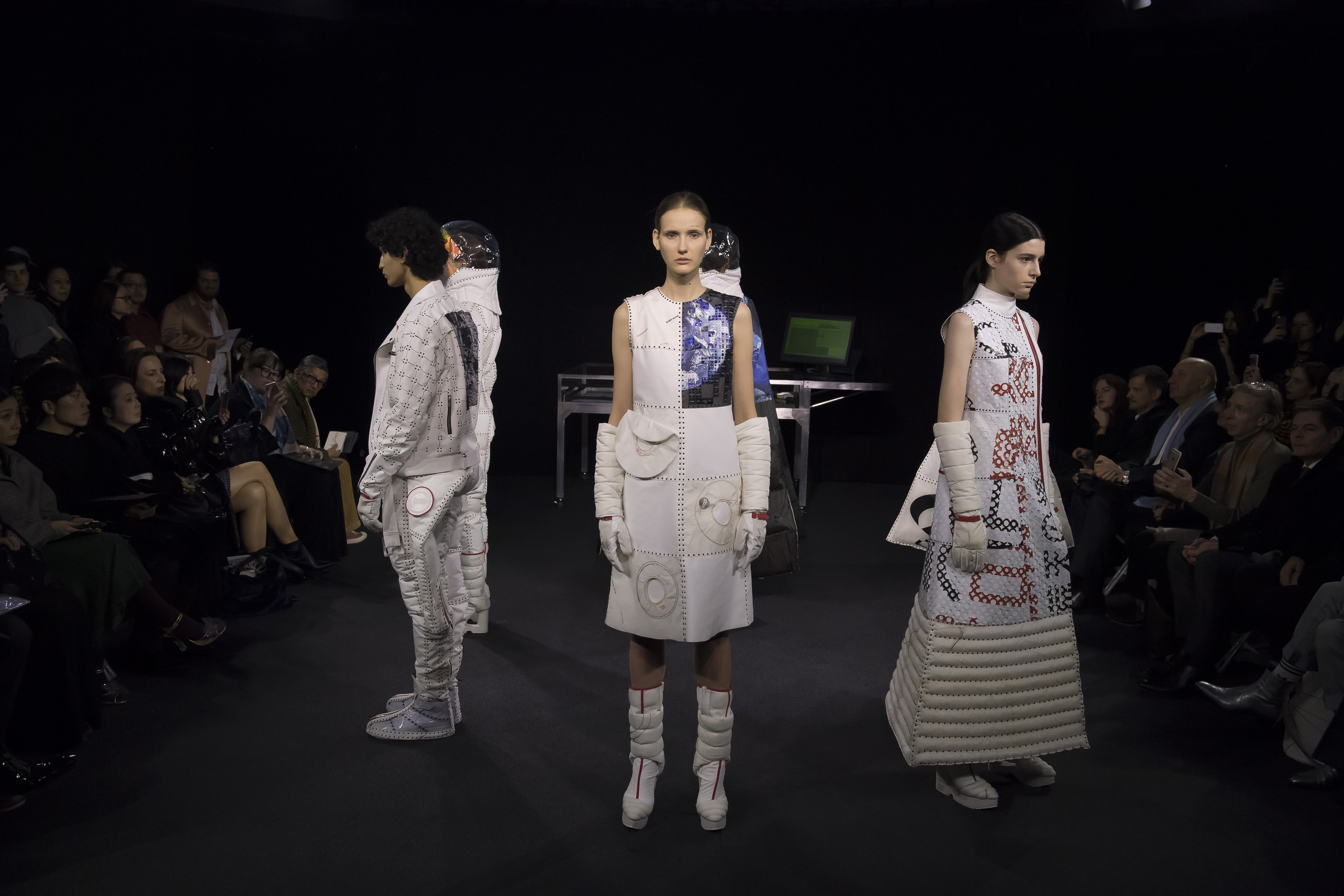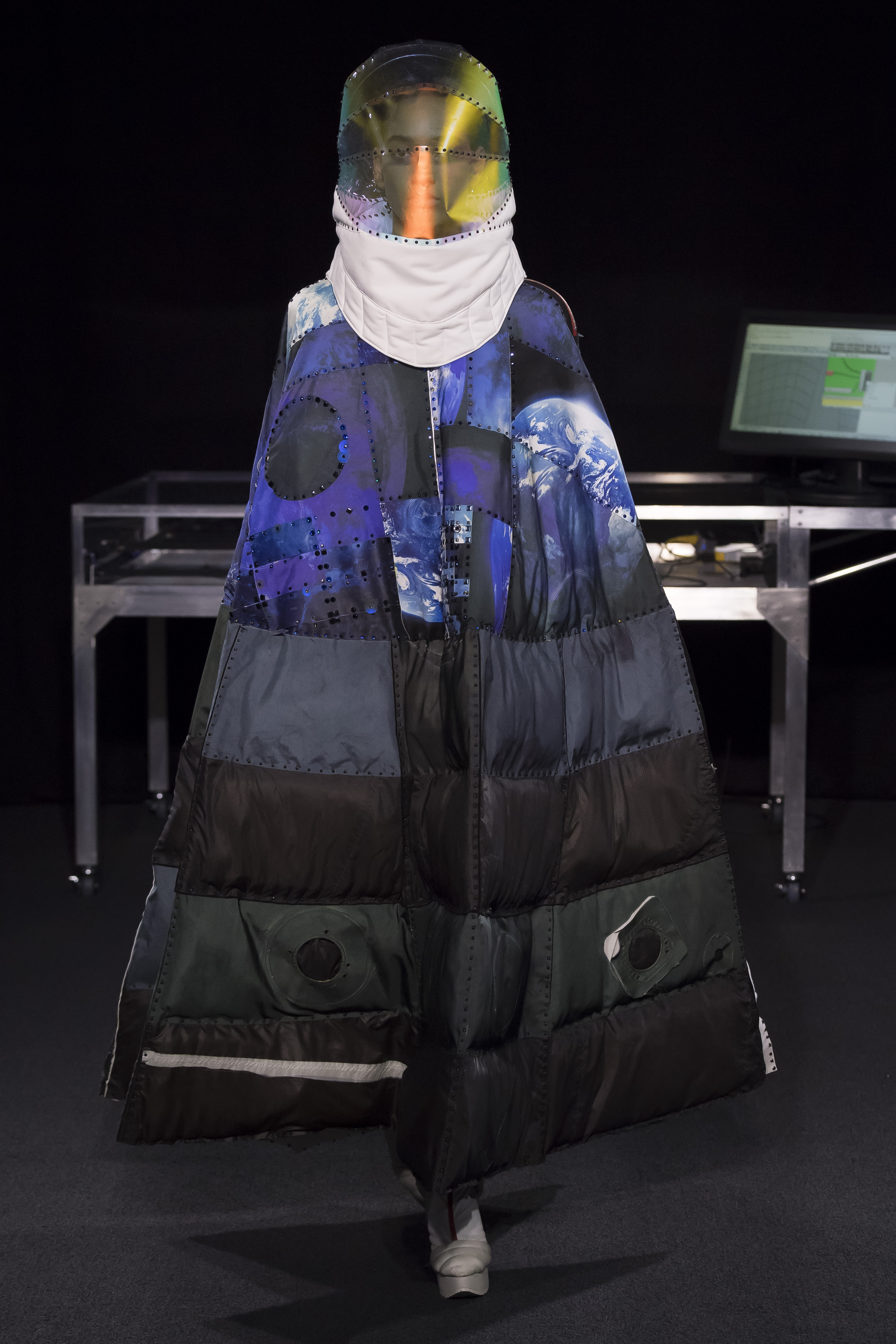 Yuima Nakazato也设想了人类和服装的未来。他的眼光和未来的焦点被吸引到了一件事上:外层空间。象征着阿姆斯壮标记人类在月球上的第一个脚印。