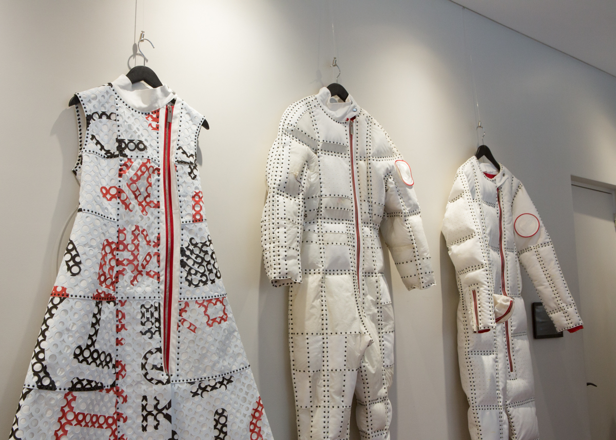 在与JAXA空间研究开发研究团队的对话中,他以可回收的工业材料作为高级时装定制的灵感来源,如降落伞和安全气囊。